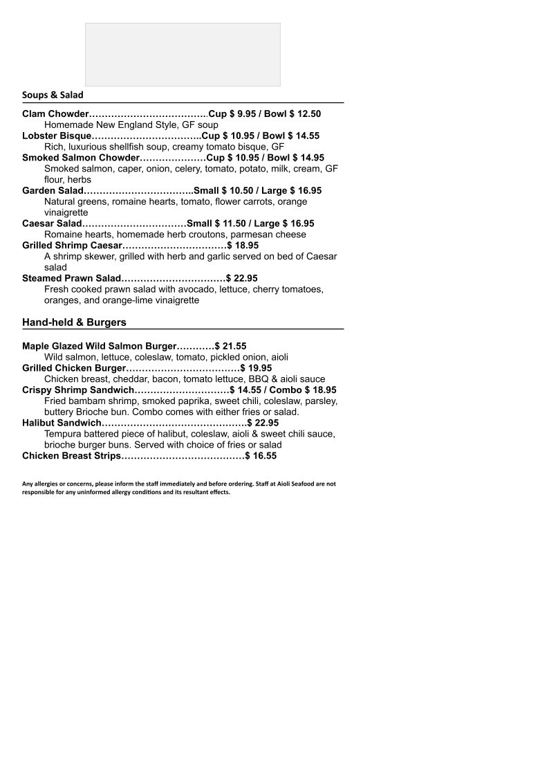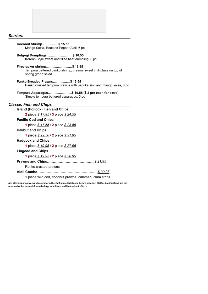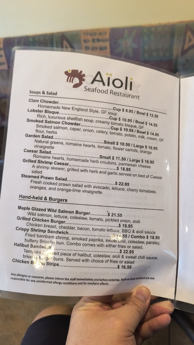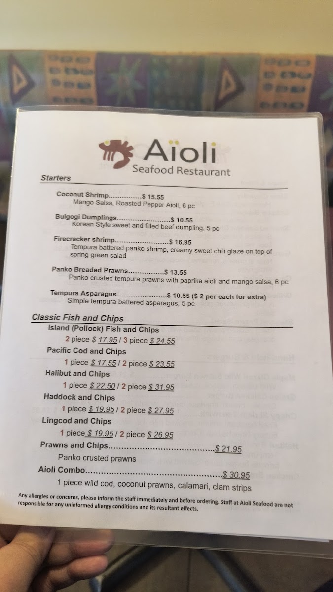 Welcome to Aioli Seafood Restaurant, a hidden gem located in Parksville, BC. Here, seafood lovers can indulge in a menu that celebrates the ocean's bounty, with a focus on freshness and quality. The star attraction, the classic Fish & Chips, features multiple options including Island Pollock, Pacific Cod, and succulent Prawns—a true delight for any palate.
